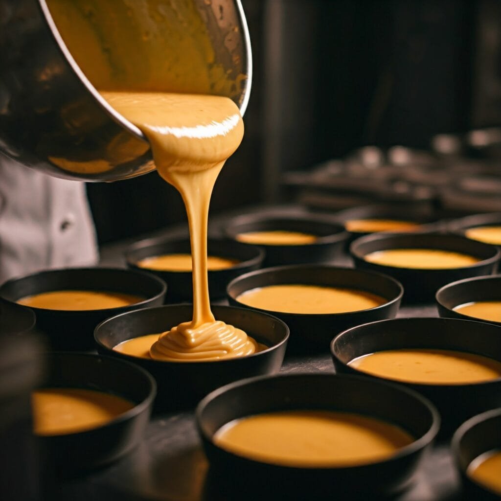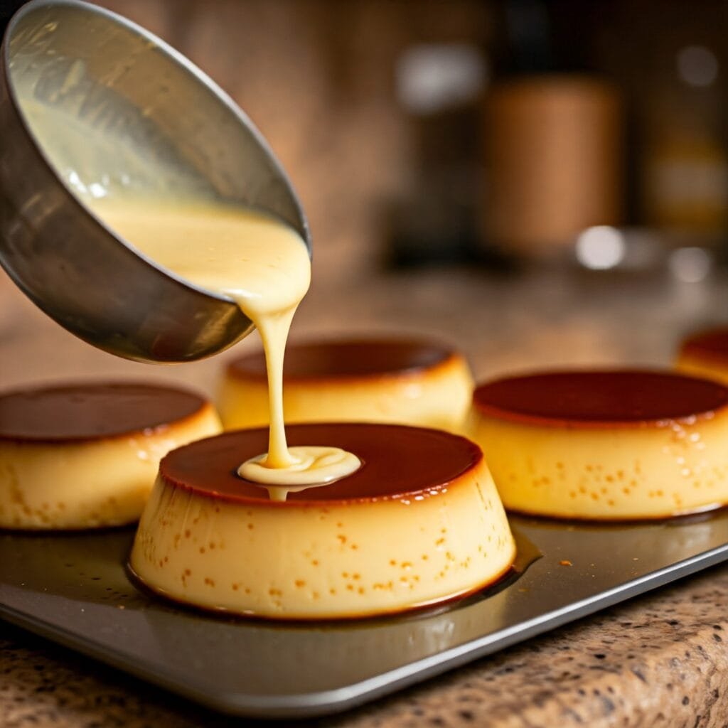5.  Vierte la mezcla de flan sobre el caramelo en los moldes preparados