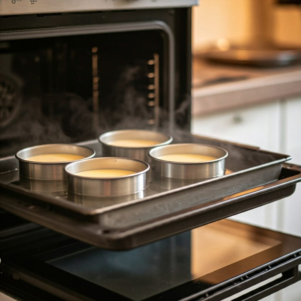 6.   Coloca los moldes en una bandeja para hornear grande, llena la bandeja con agua caliente hasta la mitad de la altura de los moldes de flan (baño María) y precalienta el horno a 180 °C (350 °F)
