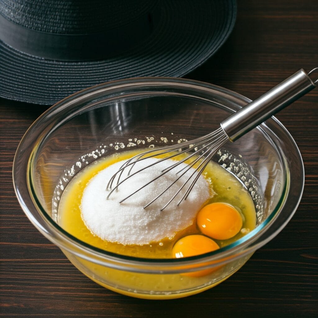 3.  En un bol grande, bate los huevos junto con los 100 g de azúcar hasta que estén bien mezclados.
