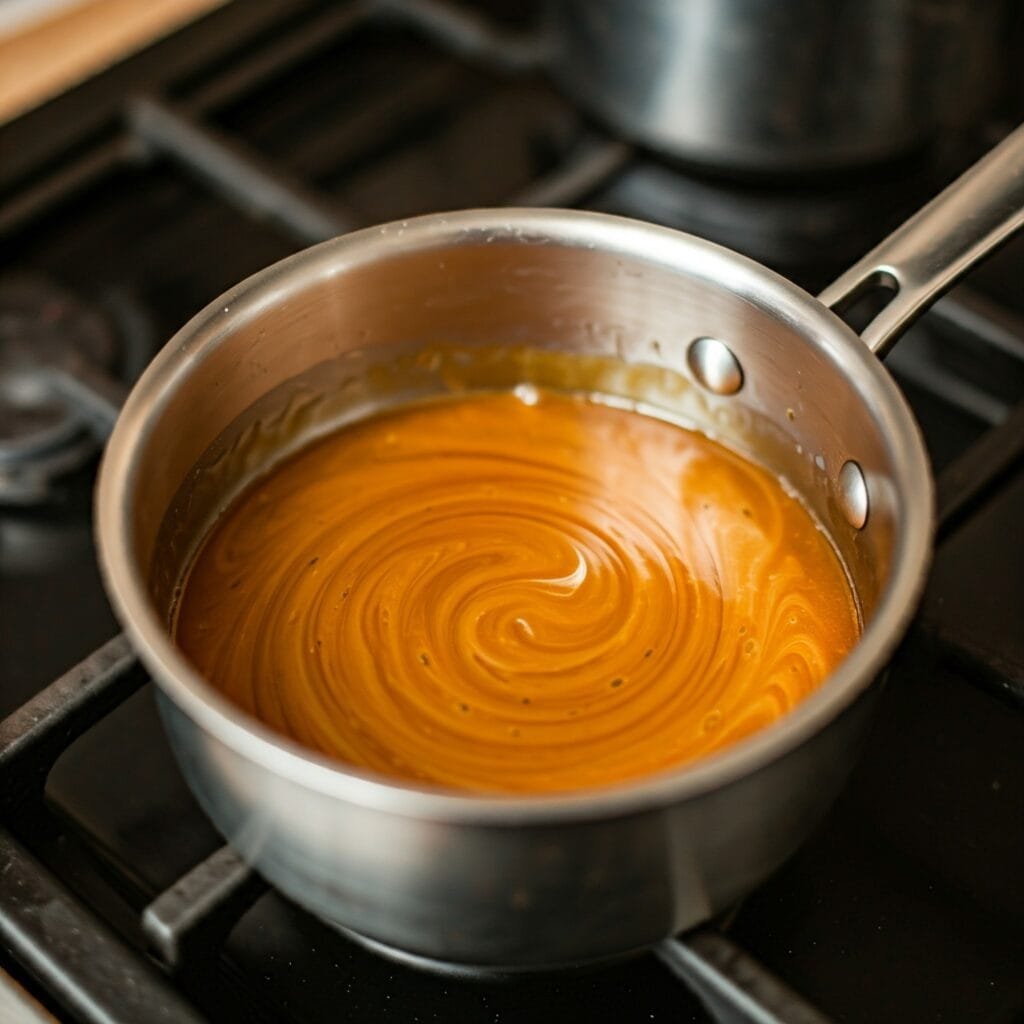 1.    En una cacerola pequeña, calienta 100 g de azúcar a fuego medio-bajo y deja que el azúcar se derrita lentamente hasta obtener un caramelo dorado.
