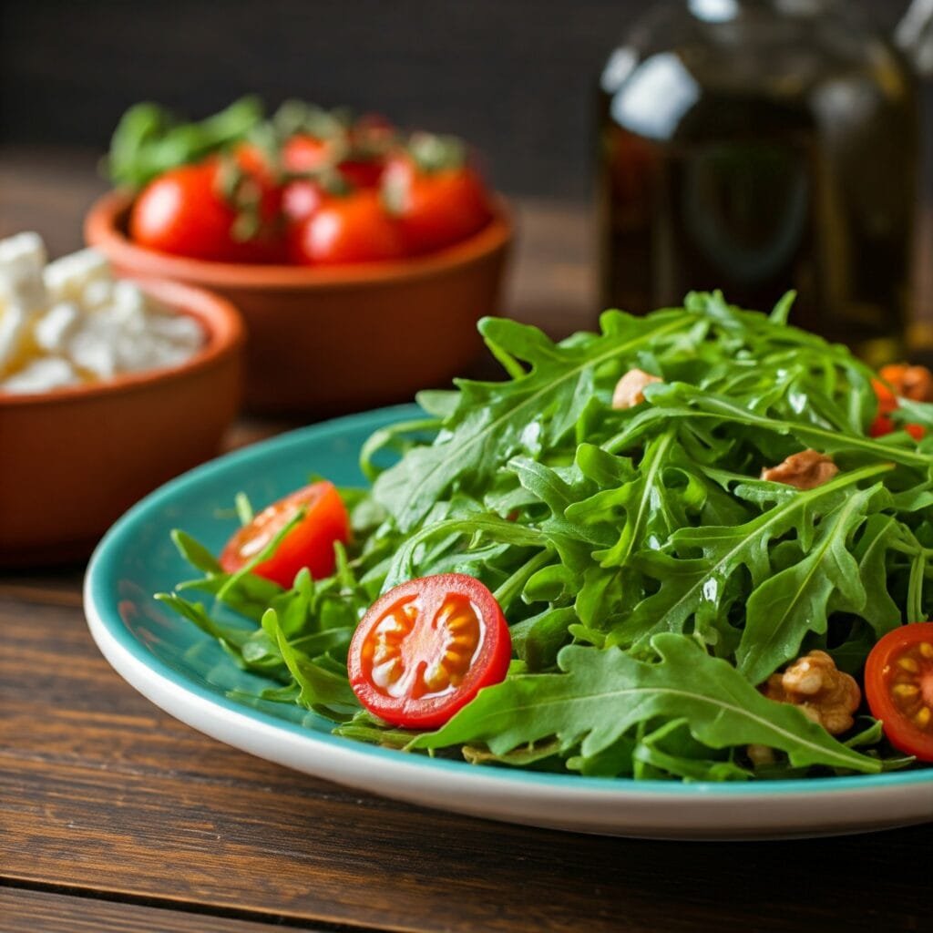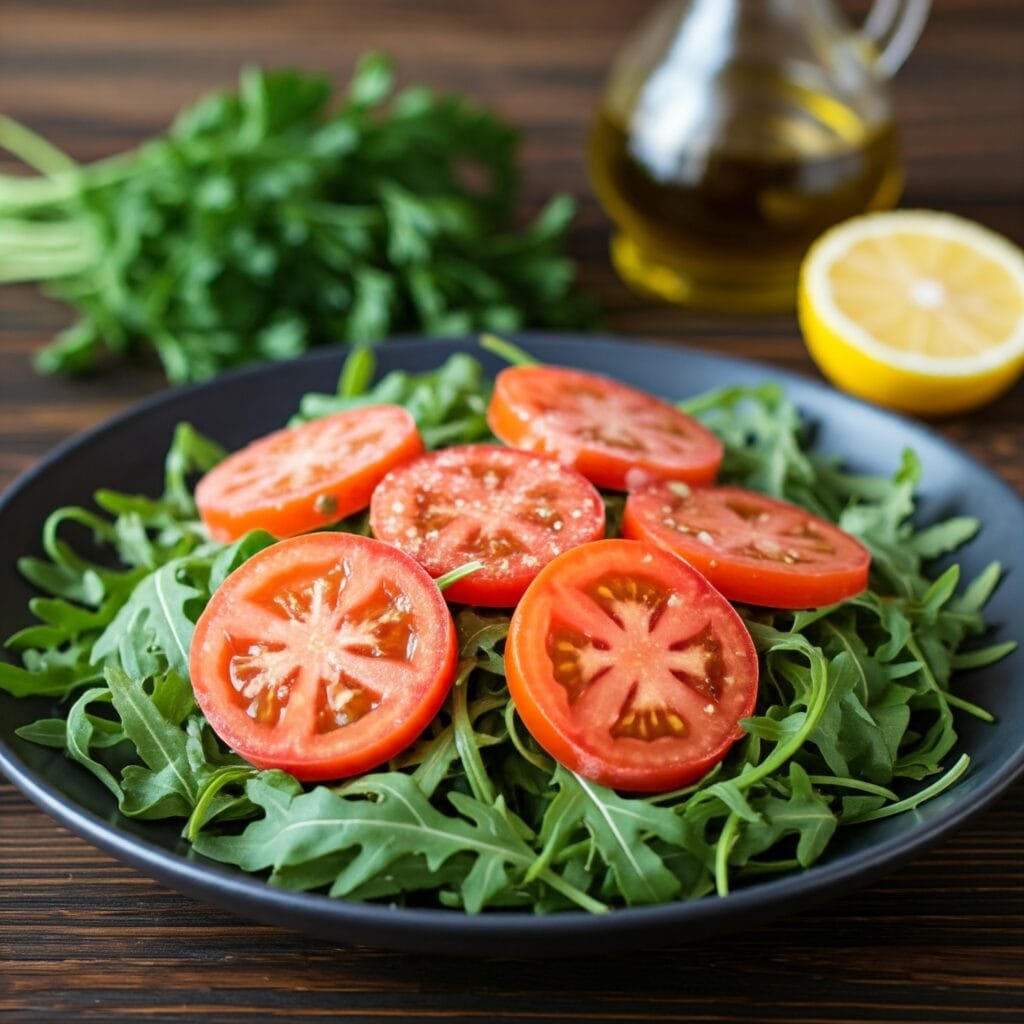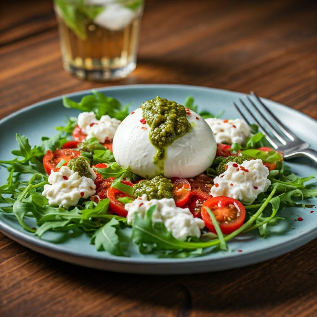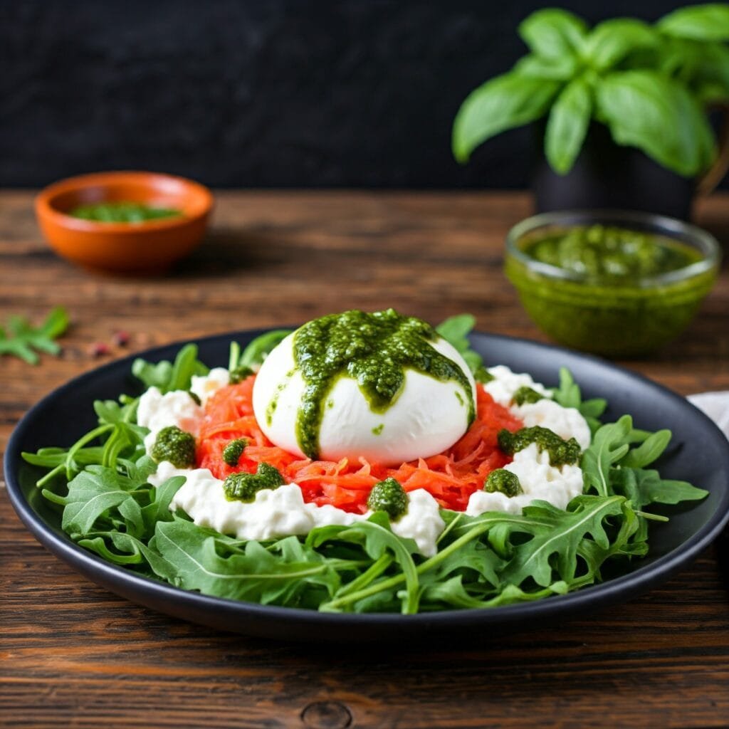 Para preparar esta ensalada de burrata , se utiliza una base de rúcula fresca que sirve como cama para el resto de los ingredientes, proporcionando un sabor sutilmente picante que contrasta con la suavidad de la burrata y el frescor del tomate congelado. Este toque de rúcula, combinado con un chorrito de aceite de oliva virgen extra, eleva los sabores y añade profundidad al plato sin sobrecargarlo. La salsa pesto, idealmente casera, añade un toque de sabor mediterráneo, aportando una rica combinación de albahaca y ajo que se complementa perfectamente con el resto de ingredientes.