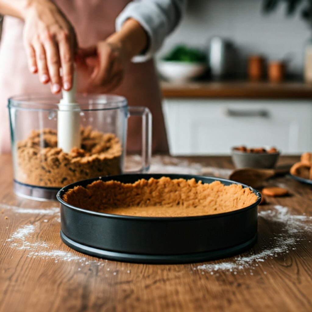 Tritura las galletas en una trituradora y mezcla con la mantequilla a temperatura ambiente hasta obtener una base uniforme. Presiona esta mezcla en un molde desmontable.
